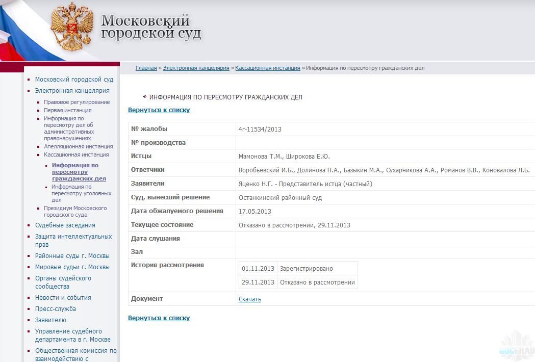 Отклонение кассационной жалобы Мосгорсудом, поданную главным юристом ВК Комфорт Яценко Н. Г. в очередной раз подтверждает законность решения жителей о смене УК.
