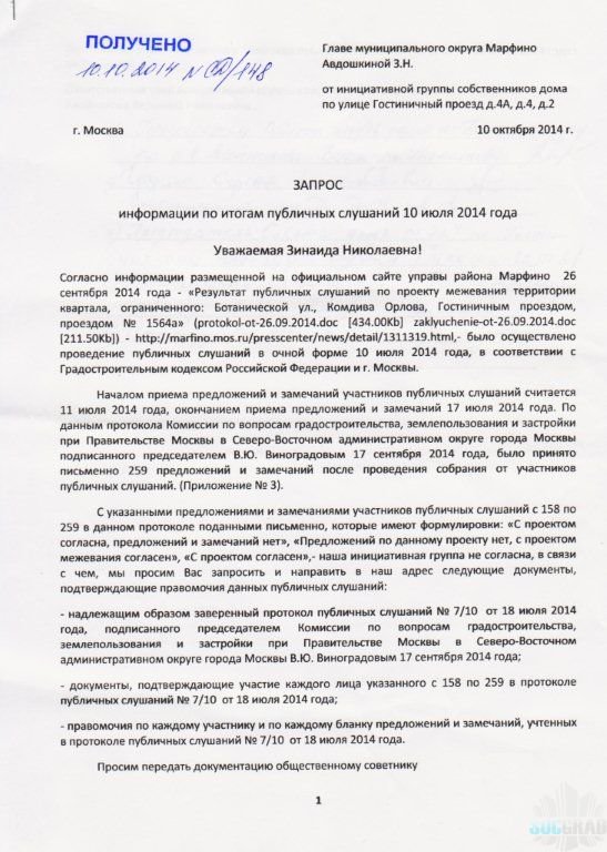 Запрос у Главы муниципального собрания района Марфино Авдошкиной Зинаиды Николаевны информации по итогам публичных слушаний от 10 июля 2014